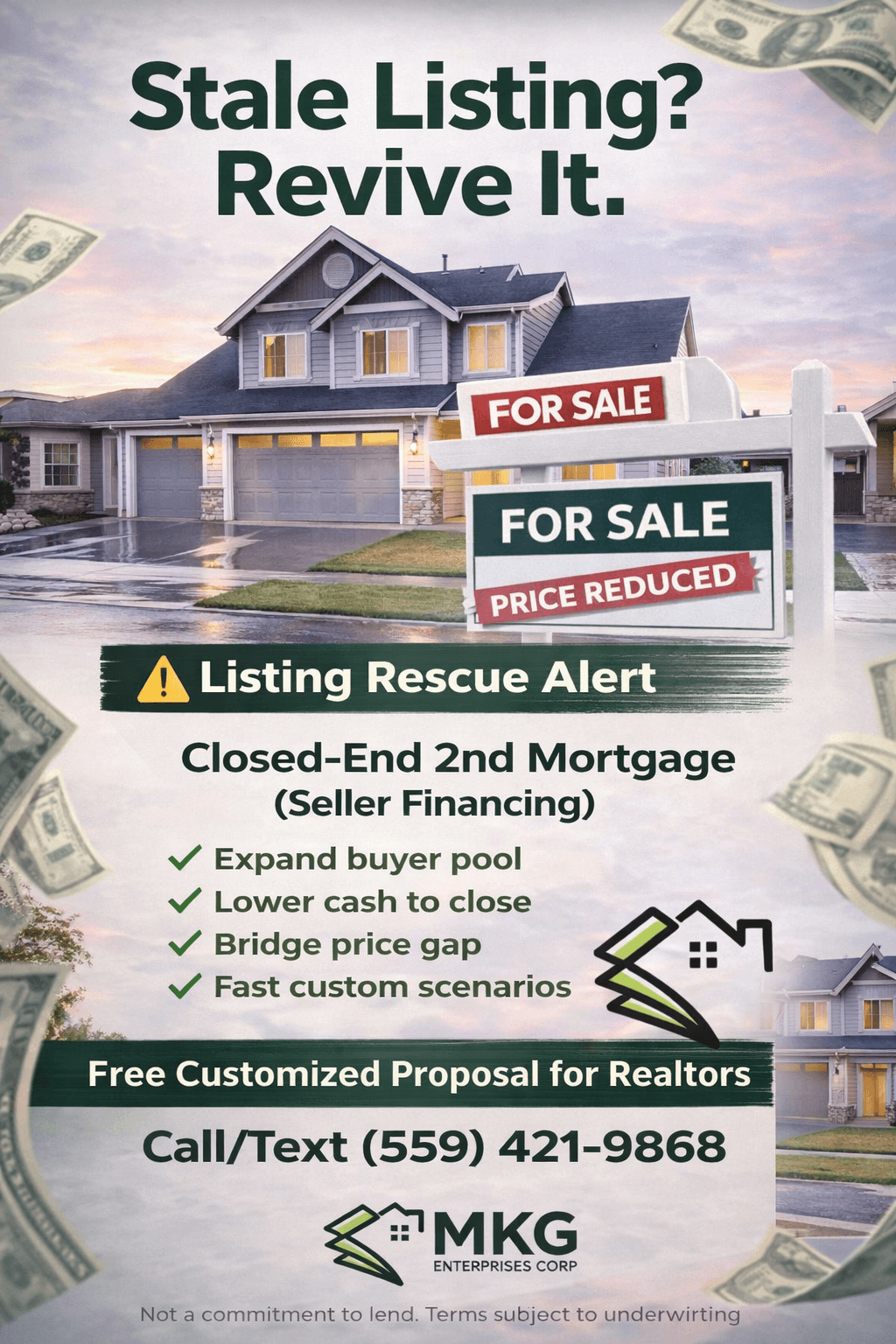 Stop chasing price reductions. Revive the deal with an MKG Enterprises Corp Closed-End 2nd Mortgage (Seller Financing)—a structured seller-carry 2nd that can pair with a conventional first mortgage to help bridge the gap and get your listing SOLD.